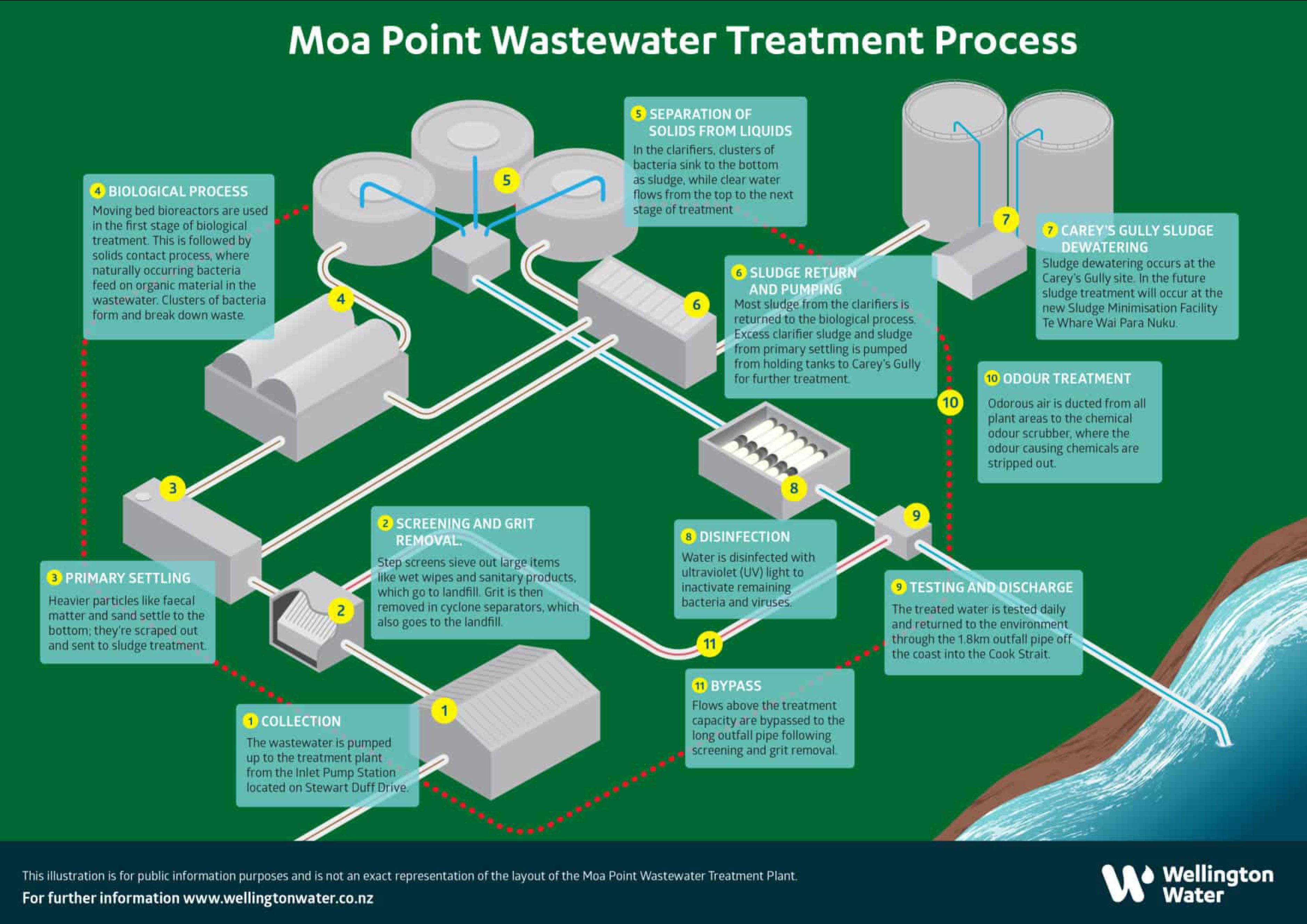 Wastewater - travels through a series of screens, tanks, bioreactors, clarifiers and ultraviolet treatments before being discharged as liquid into Cook Strait.