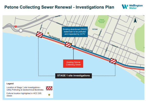 We're about to start investigations on the Petone Collecting Sewer. This will inform how we approach the pipe replacement. Investigations start on Sunday, 12 October 2025, and are expected to be completed by January 2026. The main works, the pipe replacement, is expected to start in 2027.