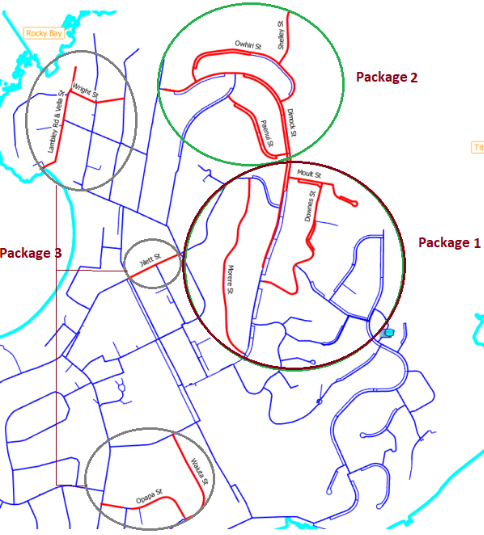 We are replacing about 2,496 metres of pipe in in Moult Street, Keith Hart Grove, Downes Street, Morere Street and part of Dimock Street. These pipes are up to 70 years old and in poor condition.