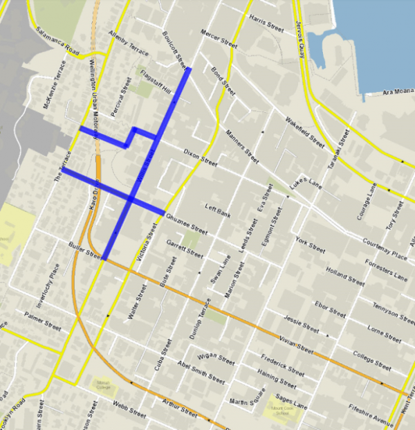 Willis Street will be closed between Vivian Street and Manners Street. Ghuznee Street will also be closed between The Terrace and Victoria Street. See map below.