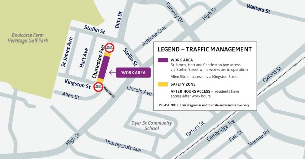 This arrangement will be in place for the next two months. Pedestrian access to Charleston Avenue will be maintained throughout. Vehicle access to St James Avenue, Hart Avenue, and Allen Street will continue to be available via Stellin Street and Kingston Street for residents, businesses, pedestrians, deliveries/couriers, and medical and emergency services.