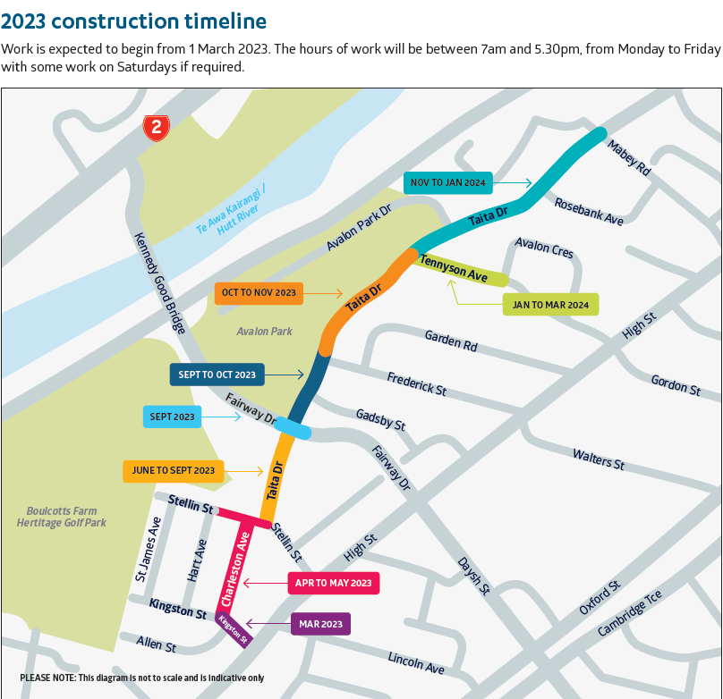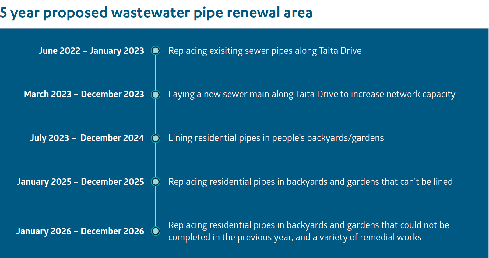 Year 2 works are scheduled to begin the week of January 30, 2023. This involves replacing pipes that carry wastewater along the centre of Taita Drive and across Fairway Drive.