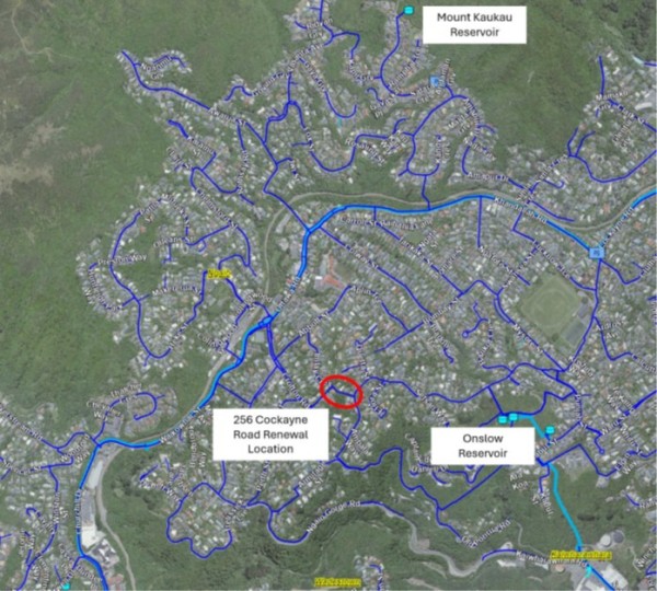 The cast iron water main laid in 1925 running between Cockayne Road and Imlay Crescent forms an integral part of water supply to the Onslow zone. The pipe was taken out of service following a failure in June 2024.