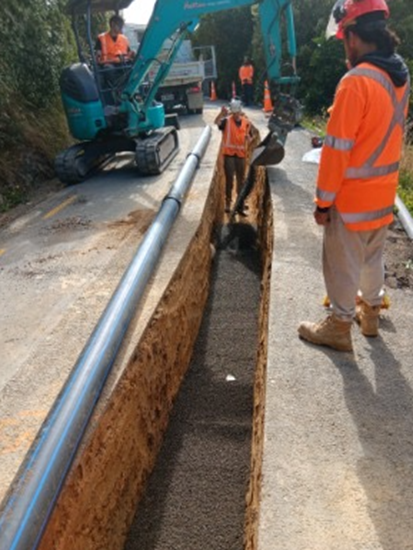 Installation of the main pipe on Howard Road between the upper and lower Nikau Road junctions is now completed and tested. The crew will be back later to connect all the properties to the new pipe during the commissioning phase.