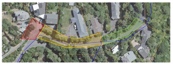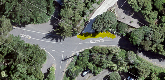 Howard Road below the upper intersection with Nikau Road. 53 Howard Rd to 2A Nikau Rd.