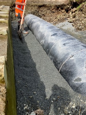 Our team are working to repair several sections by digging them out and re-wrapping them with a corrosion-resistant wrap tape, and a protective PE cap, before burying them again. The repair, and safe passage of the native fish and eel population, is supported by reinstating the streambed and banks with erosion protection concrete blocks and rock rip rap.