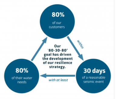 We have a long-term strategy to build water network resilience, called ‘Towards 80-30-80’. The ultimate goal of this strategy is to provide 80 per cent of customers, within 30 days of a reasonable seismic event, with 80 per cent of their normal water needs.